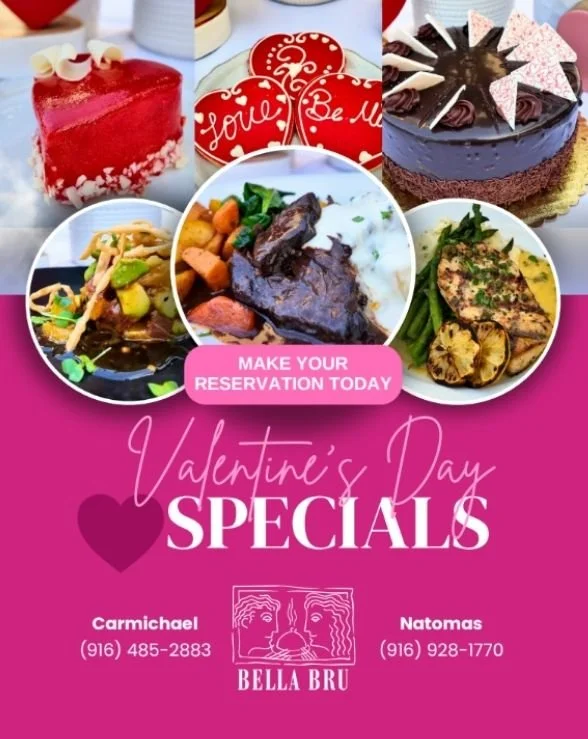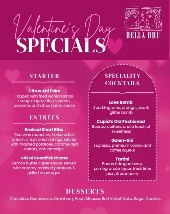 Celebrate Valentine’s Day at Bella Bru Cafe with handcrafted specials made to impress. Indulge in decadent desserts like our Chocolate Decadence or Red Velvet whole cakes, heart-shaped Strawberry or Brandy Chocolate Mousse, and festive sugar cookies. Enjoy fresh, locally inspired dishes like our Citrus Ahi Poke or Grilled Swordfish with lemon caper sauce, creamy mashed potatoes, and grilled asparagus, and MORE! Toast to the night with romantic cocktails like the Love Bomb mimosa, Tartini, or Galen-tini espresso martini.